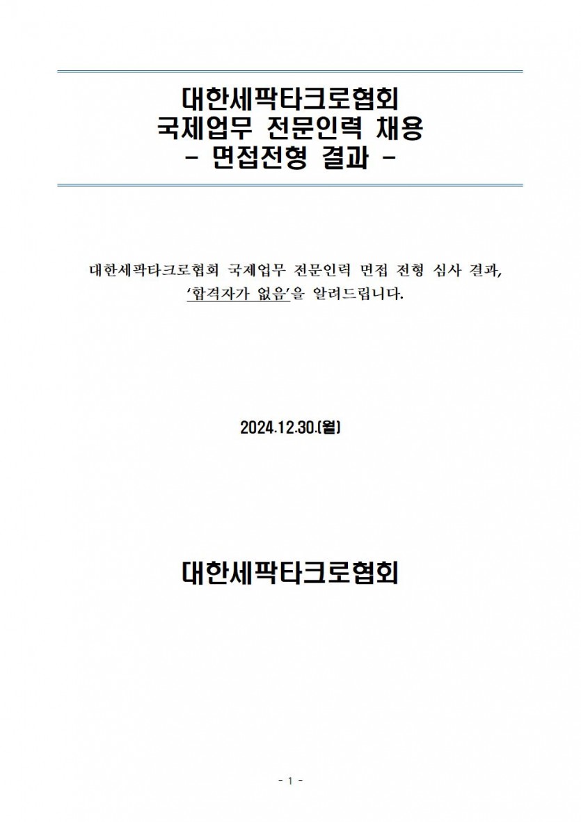 [대한세팍타크로협회] 국제업무 전문인력(계약직) 채용 면접전형 결과(합격자 없음) 공고 > 공지사항